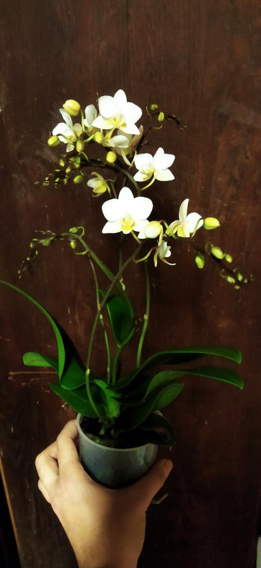 Jolie orchidée phalaenopsis à l'effet sauvage avec sa multitude de petites fleurs blanches et ses nombreuses tiges et ramifications qui ont poussées tel quel, sans tuteur.