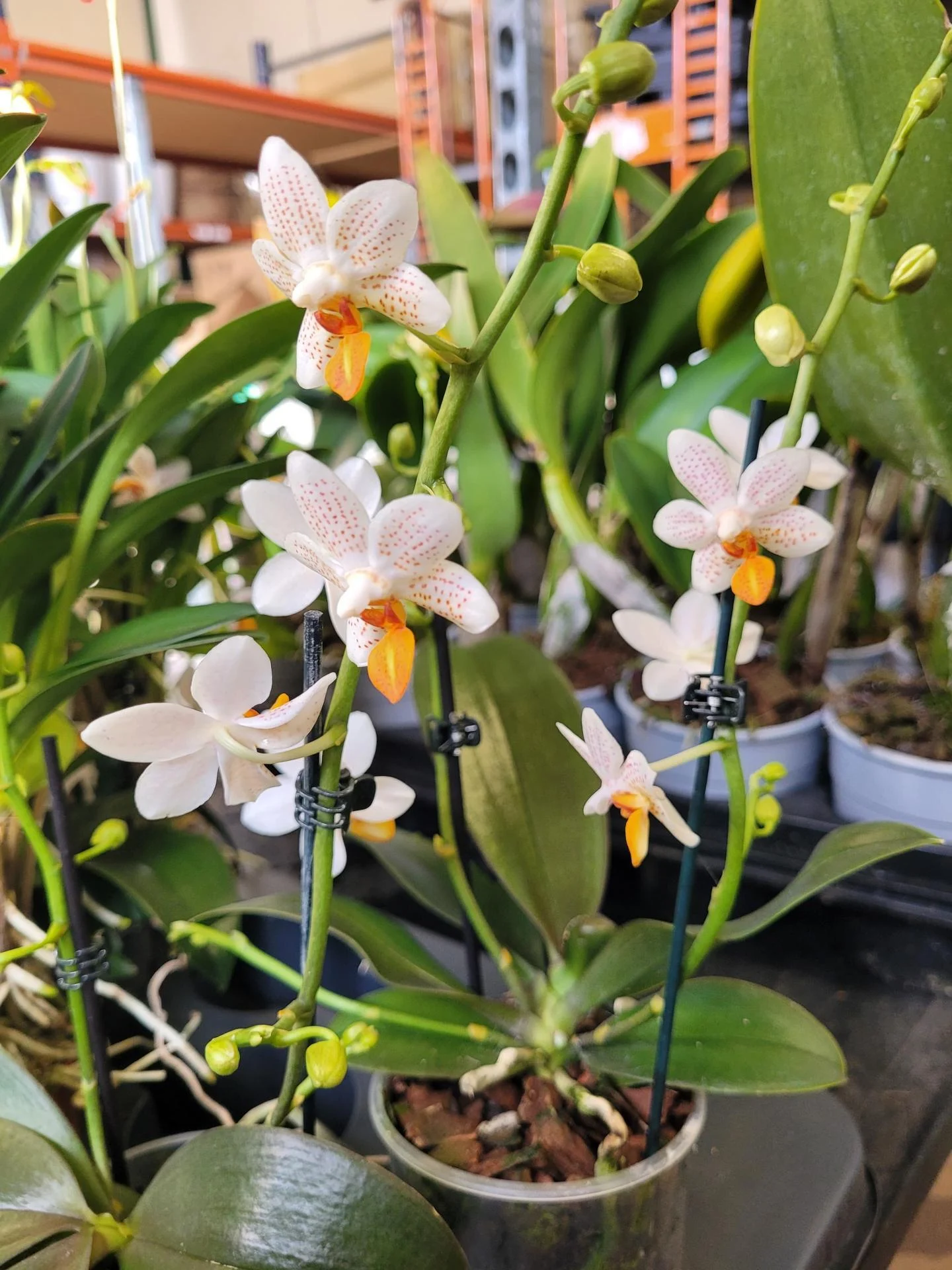 Jolie phalaenopis aux fleurs subtiles blanches avec des dessins oranges très fins.