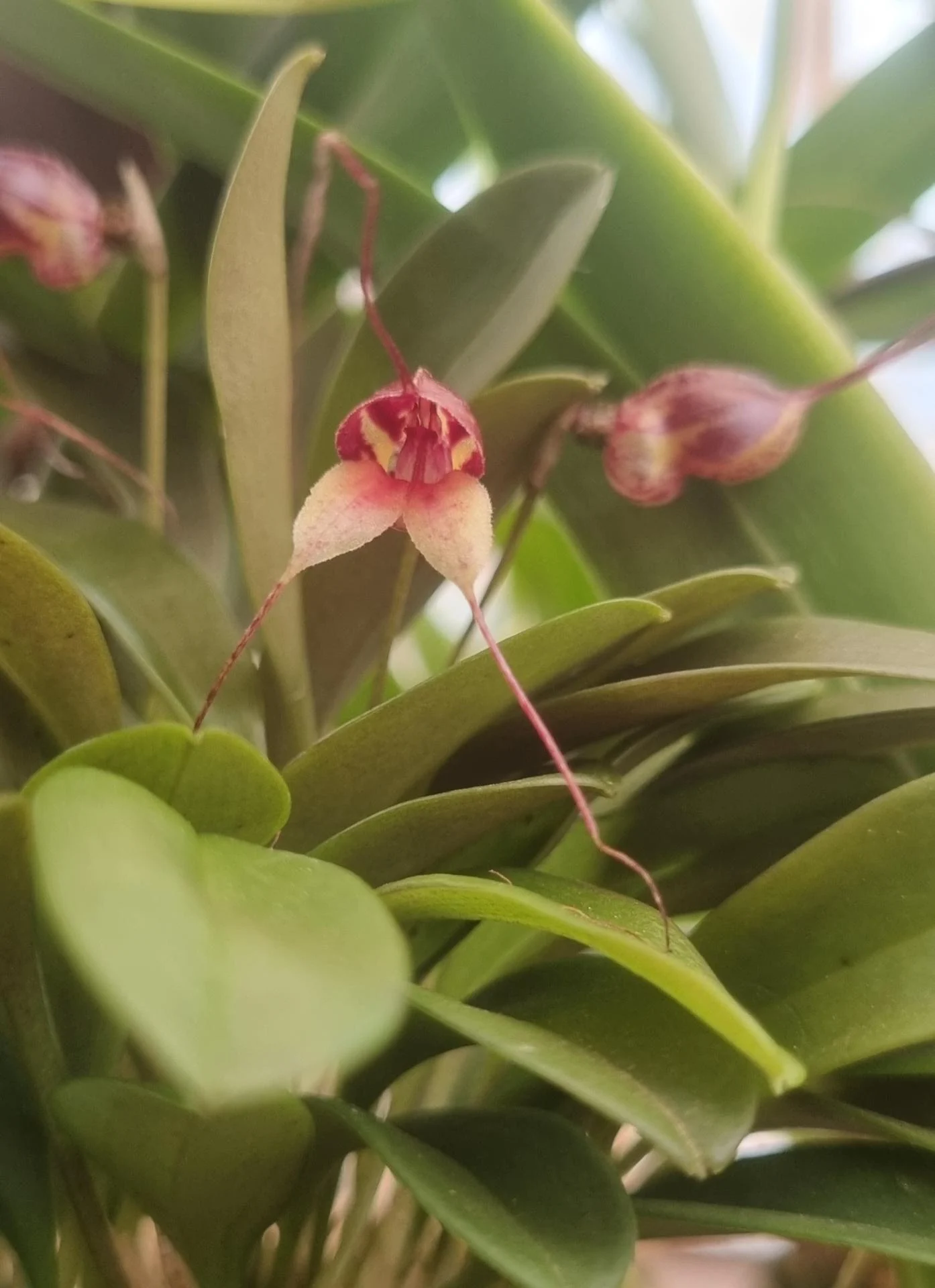 Les Madevallias apprécient la fraicheur (12-20°C), l'humidité et la mi-ombre. Brumiser réculièrement l'air ambiant en évitant les fleurs.